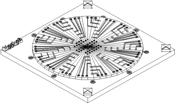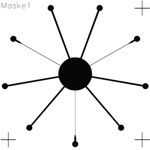 Für die Anordnung der Leiterbahnen auf Maske 1 wählten wir eine sternförmige Struktur, auf der die Kondensatoren radial angeordnet werden können. An den Enden der Leiterbahnen sind Kontaktflächen zum Bonden vorgesehen (Æ 800 µm).