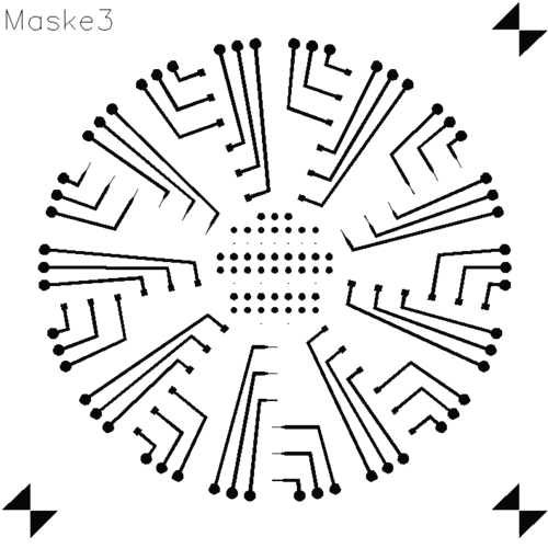 Kurze Bondwege wurden durch das wechselseitige Hinausführen der Anschlußleitungen der Kondensatorplatten (Maske 3) erreicht. Die hinausgeführten Anschlüsse auf dieser Maske haben eine Leiterbahnbreite von 100 µm, die Kontaktflächen sind mit einem Durchmesser von 400 µm aufgrund der begrenzten Fläche kleiner als auf Maske 1, jedoch für Bondprozesse noch ausreichend groß.